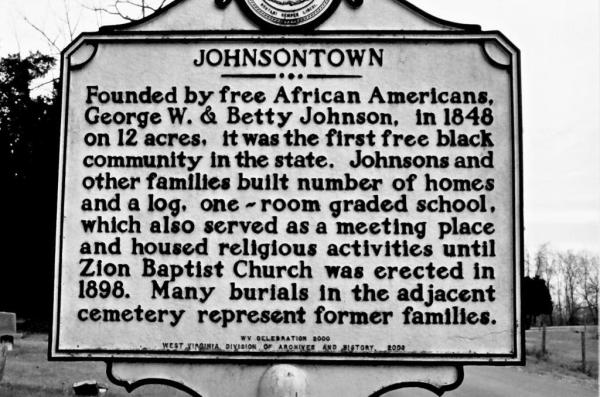 05000.CO – JOHNSONTOWN The above sign marks the location of Johnsontown, the first free black community in the state of WV. George W. and Betty Johnson were free African Americans who founded Johnsontown in 1848 on 12 acres of land. Families built several homes in the town along with a one-room graded school. That school also served as a community meeting place. It also served as a religious facility until 1898 when the Zion Baptist Church was built. Former families which lived in Johnsontown are buried in the adjacent cemetery.