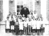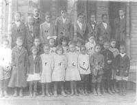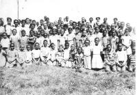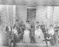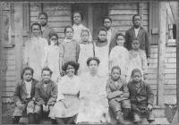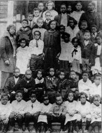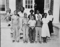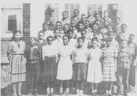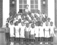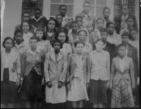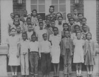 07028.ED – How nicely these students are dressed for school. Although there is no date, many of the students are identified: they are, from left to right: (first row) Norman Saul, B. Johnson, Elizabeth Williams, Hallie Rutherford; (second row) Sisumond Taylor, Gertrude Brown Lawson, Ruth Tucker, Margaret Jackson, Josephine Luckett, Helen Burman, and Georgia Cool; (third row) Julia Rutherford, John Rutherford, Lem Wise, ? Wise, ? Rutherford, two unidentified, and Louis King; (fourth row) Reverend Yearwood.