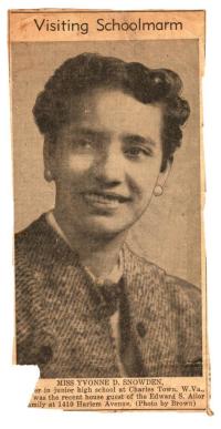 07034.ED – Pictured is Miss Yvonne D. Snowden who was a teacher in the junior high school at Charles Town, WV. Miss Snowden was a house guest of Edward S. Ailor and family at 1410 Harlem Avenue. The photo was taken by Brown.