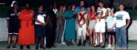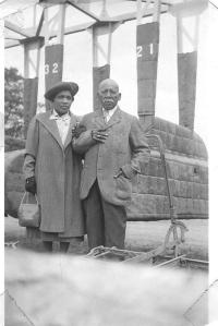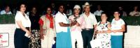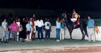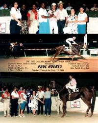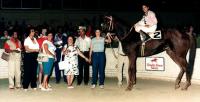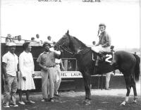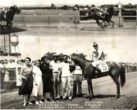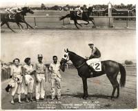 11013.HR – This photo from July 31, 1956 shows third from left, Sylvia Rideoutt Bishop, the first African American female thoroughbred racing trainer in the United States pictured at Charles Town Race track. She is flanked by her sister, Irma Rideoutt Berry and mother Bertha Snowden Rideoutt on her right and her husband John Bishop and John E. Berry, her brother-in-law, on her left. Ms. Bishop’s accomplishment came a long way from the first Charles Town Colored Horse Show in 1917.