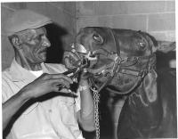 11002.HR – Theodore Togans is pictured here as he examines the mouth and teeth of a race horse at Charles Town, WV. Theodore Togans is pictured here working on a thoroughbred horse. He is examining the mouth and teeth of the race horse. Mr. Togans was a veterinary dentist and worked at the Charles Town Race Track when this photo was taken. Veterinary dentistry is a specialized field which requires attention to detail and dedication. which Mr. Togans had to have had to be successful.